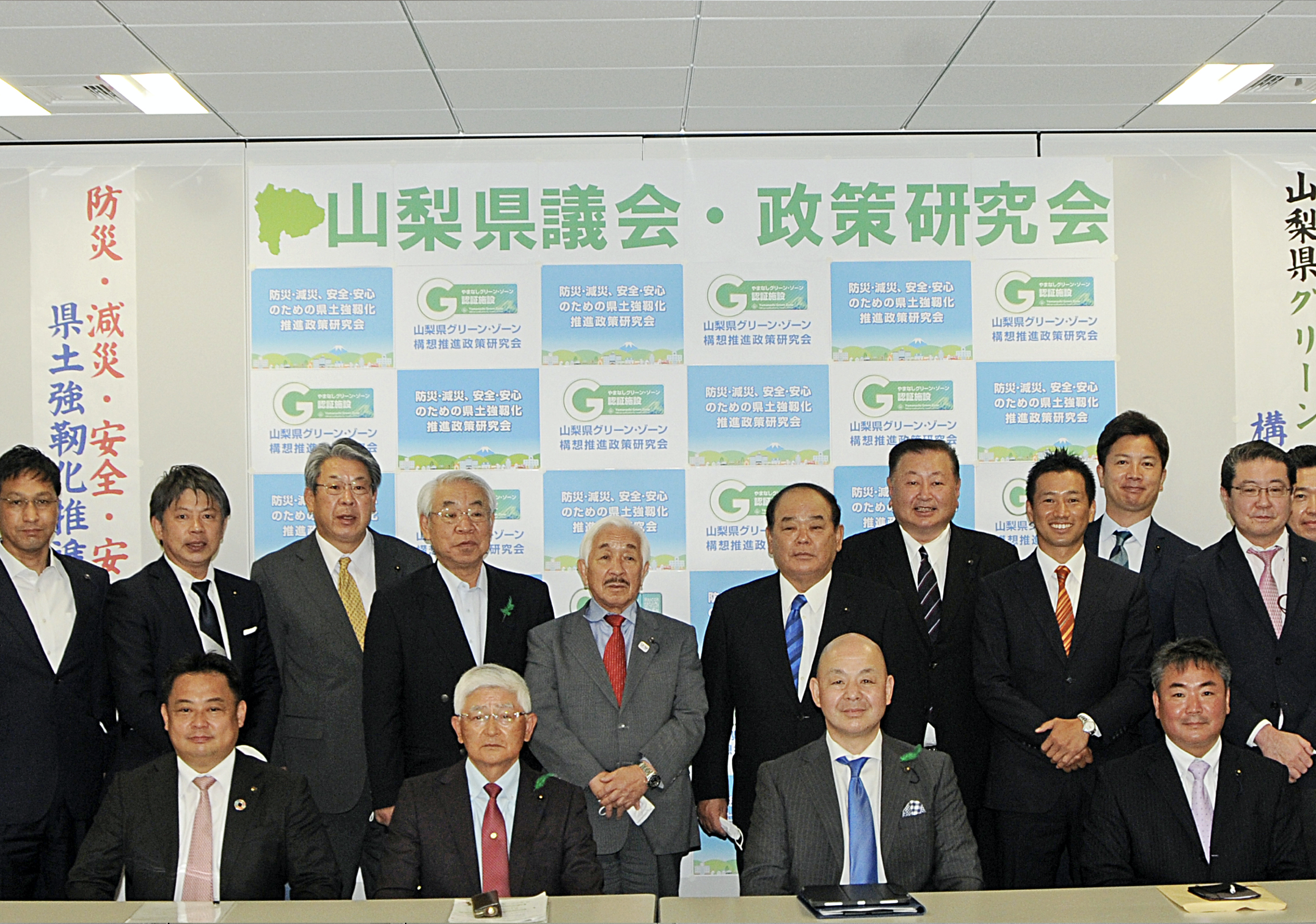 県土強靭化と山梨県グリーンゾーン認証制度を積極的に推進するために18人の県議による「山梨県議会・制作研究会を立ち上げました。