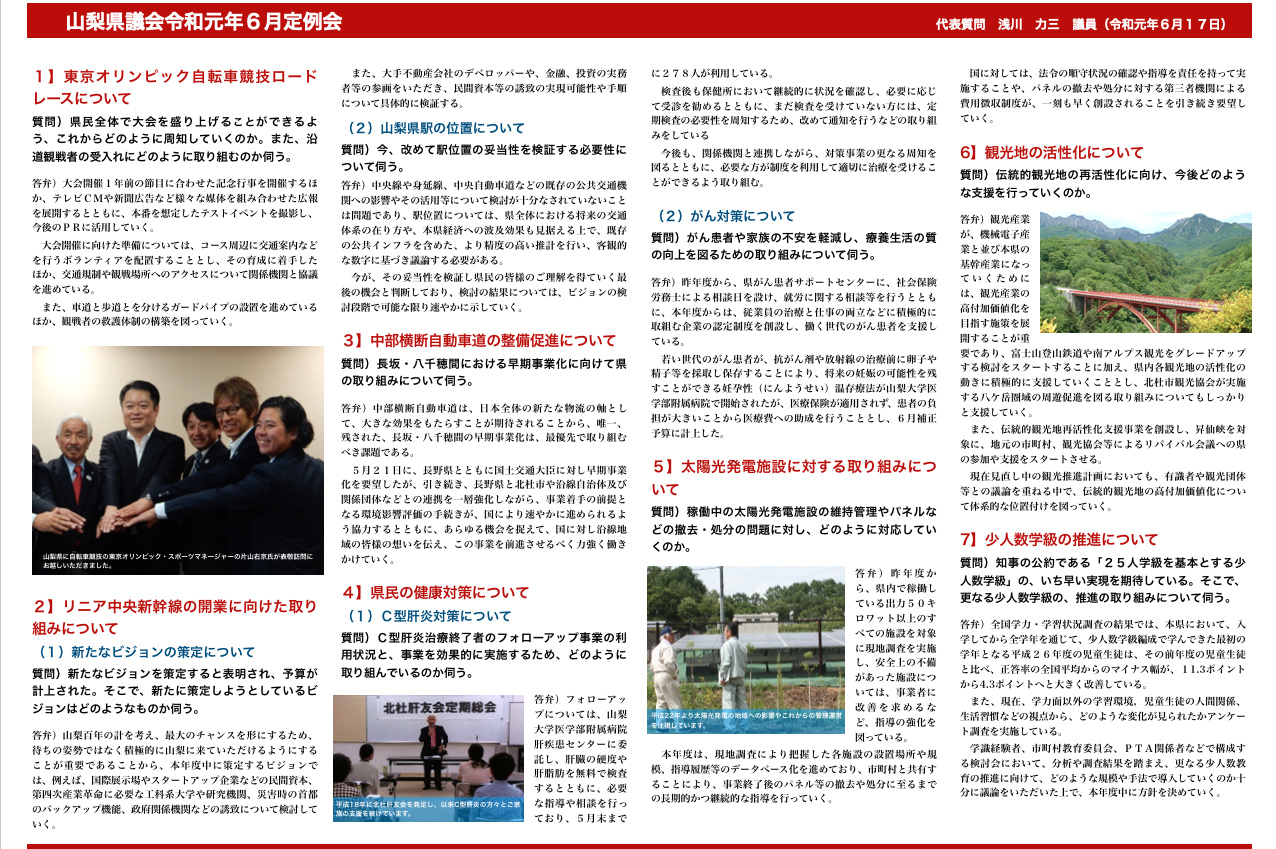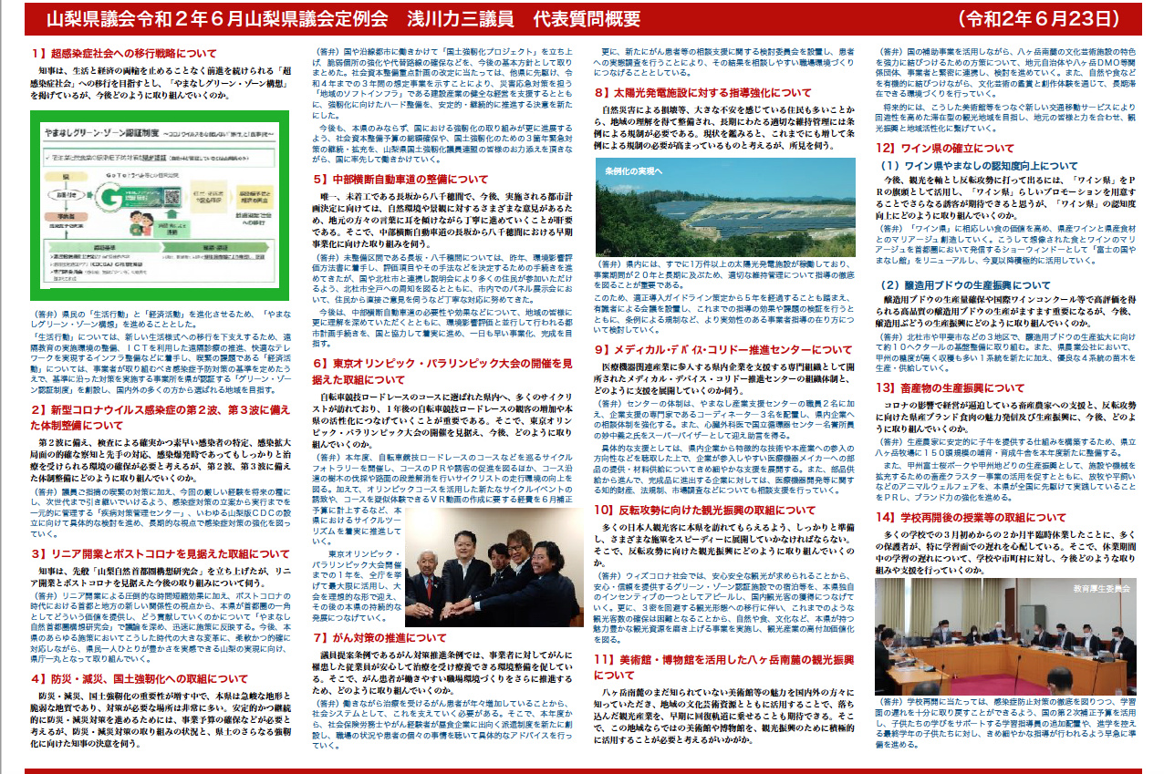 山梨県議会6月定例会の代表質問でも、これまでにも増して条例による規制の必要性が高まってきているものとの認識の下、条例制定に向けた知事の考えを質し、知事は、条例による規制など、より実効性のある事業者指導のあり方について検討をしていくと答弁しています。