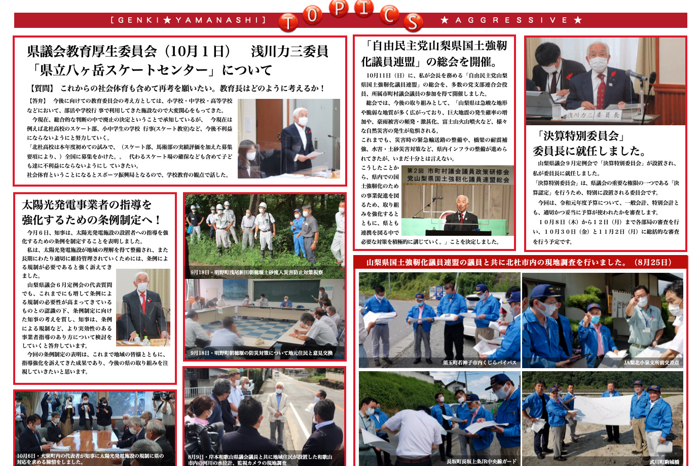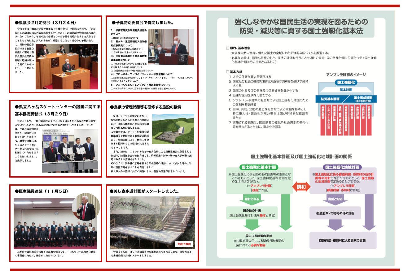 こうしたことから、県内での国土強靭化のための事業促進を図るため、取り組みを強化するとともに、県とも連携を図る中で必要な対策を積極的に講じていく。」ことを決定しました。