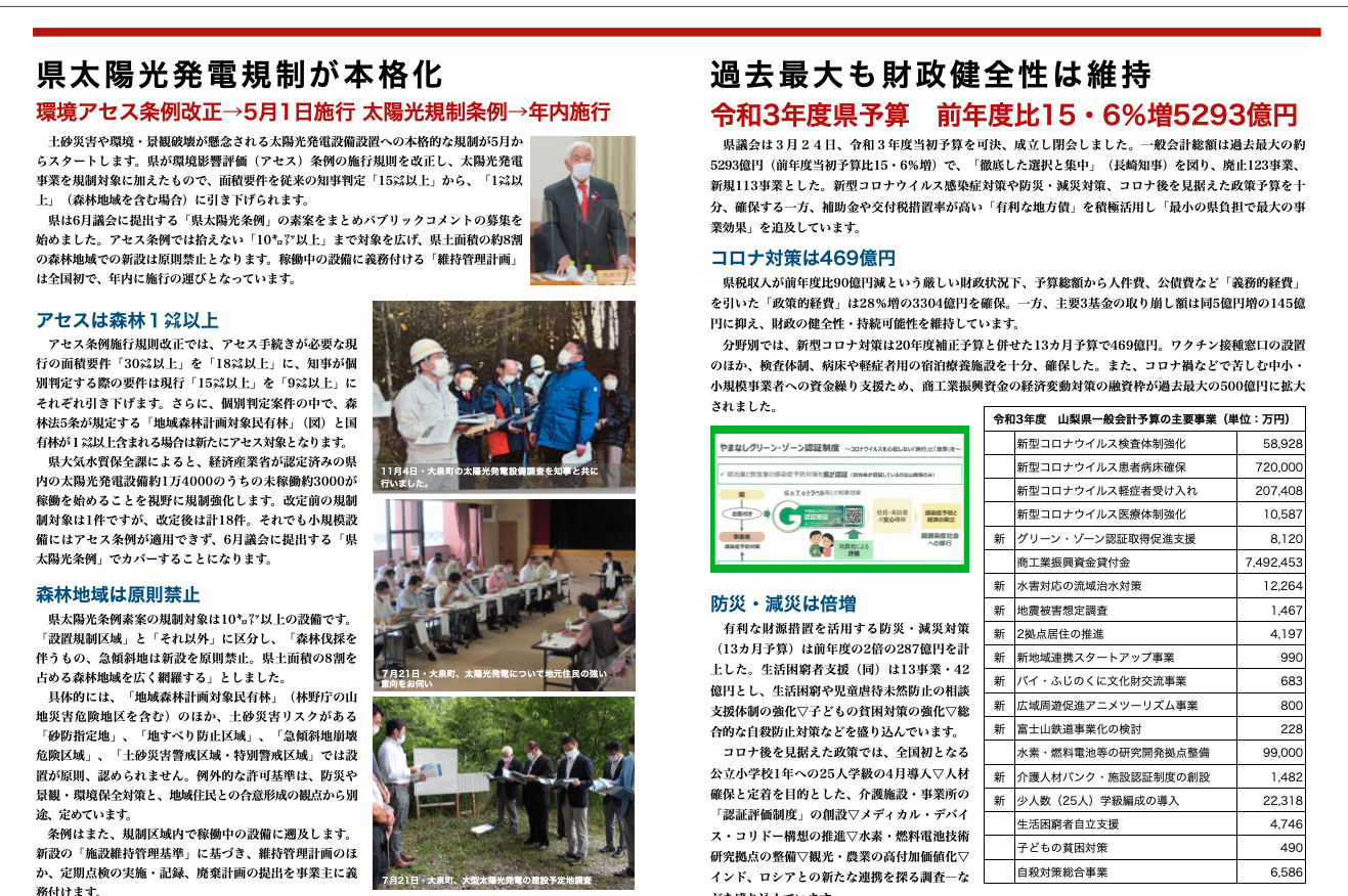 県は6月議会に提出する「県太陽光条例」の素案をまとめパブリックコメントの募集を始めました。アセス条例では拾えない「10㌔㍗以上」まで対象を広げ、県土面積の約8割の森林地域での新設は原則禁止となります。稼働中の設備に義務付ける「維持管理計画」は全国初で、年内に施行の運びとなっています。