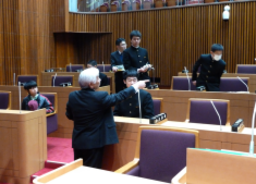 東日本大震災の犠牲者に対しまして、県議会議員一同が議事堂に集まり、黙祷を捧げました。