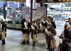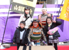 出陣前には、県議会議事堂前に設けた陣屋で、議員自ら観光パンフレットを配布したり、記念撮影に気軽に応じるなど観光客の皆様と親しくふれあい、議員自ら「おもてなしのやまなし」を実践し、本県の観光PRに一役買うことができました。