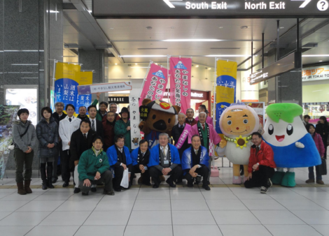 出陣前には、県議会議事堂前に設けた陣屋で、議員自ら観光パンフレットを配布したり、記念撮影に気軽に応じるなど観光客の皆様と親しくふれあい、議員自ら「おもてなしのやまなし」を実践し、本県の観光PRに一役買うことができました。