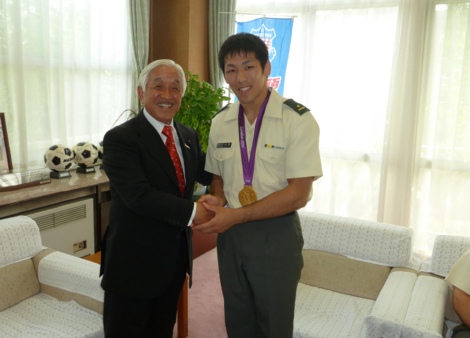 7月22日、県立甲府工業高校との決勝戦を8-4で制した東海大甲府高校が8年ぶり11度目の夏の甲子園出場を決めたことから、このたび、県高校野球連盟の小澤清会長をはじめ、同校の新海亮人主将(北杜市)などから県大会優勝及び甲子園出場の報告を受けました。