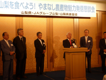 桃やぶどう、すももなど、本県が誇る農産物を広くPRする機会として、首都圏の市場関係者や山梨にゆかりの著名人、報道機関にお集まりいただき、「山梨を食べよう!やまなし農産物魅力発信懇談会」が都内(椿山荘)で開催されました。