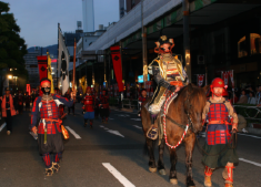 いざ出陣!の場面では、私が武田家の嫡男、武田太郎義信に扮し、武者装束に身を固めた各議員が勇壮な行進を披露し、沿道に詰めかけた10万人を超える観客の皆様からたくさんの声援と喝采をいただきました。
