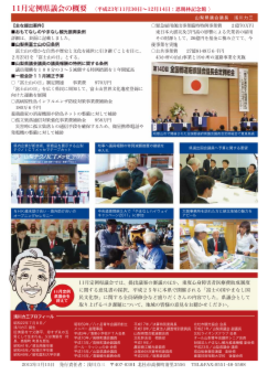 - さて、本県の平成23年は、横内知事の2期目の任期が始まり、富士山の世界文化遺産登録やリニア中央新幹線の整備に向けた手続が大きく前進するとともに、防災体制の整備、クリーンエネルギーの推進、農業における耕作放棄地の解消や後継者確保など様々な分野で今後の本県の発展につながる施策が展開されました。特に、11月議会で可決した「おもてなしのやまなし観光振興条例」は、これからの本県の観光を方向付けるものであり、今後、県が打ち出す具体的な事業に大いに期待しているところです。