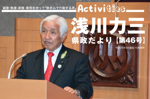 9月定例県議会で全議員の先陣を切って代表質問に登壇し、県政各般について県の施策を質しました。「当日は、180名を超える地域の皆様で傍聴席が埋めつくされました。皆様には、私と県当局との論戦に立ち会っていただき、私の活動の一端をご理解賜りましたことに、心から感謝申し上げる次第であります。」