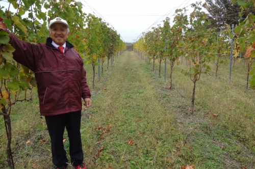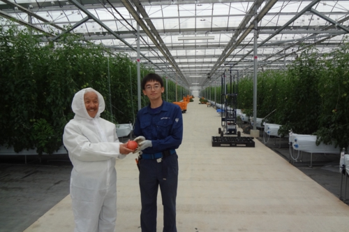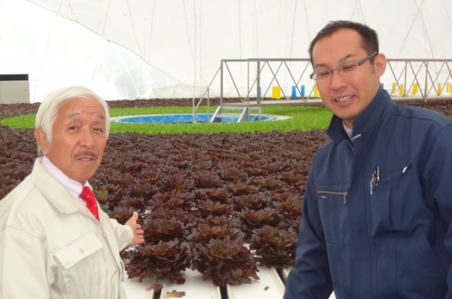 明野町九州屋村沢社長とトマト農場(ハウス)白州(株)ドームファーム金井社長とレタス畑、耕作放棄地に企業が参入してぶどう畑に!