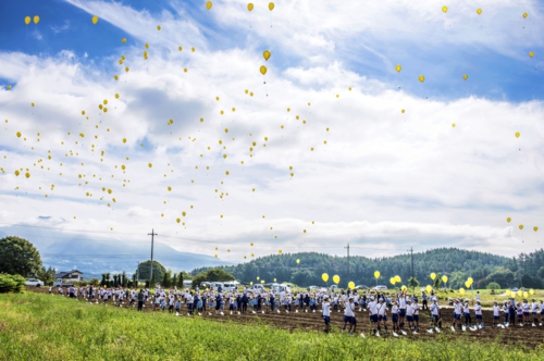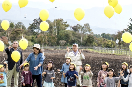 今年も2町歩の畑に菜の花の種を蒔き、大空に向けて風船を飛ばしました。参加者:高根西小学校全児童180名/小池地区長寿会30名/みどり保育園年長20名/聖ヨハネ保育園児/中北農務事務所/観光協会高根支部の皆さん 高根西小学校全児童/みどり保育園児
