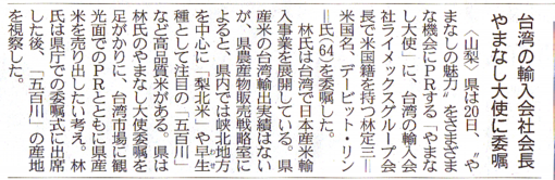 8月20日にやまなし大使に任命された台湾の輸入会社の林定三(デービッド・リン)会長とともに委嘱式後に今年台湾に1トンの輸出が決定している北杜市の農業法人「こぴっと」の稲作を視察しました。